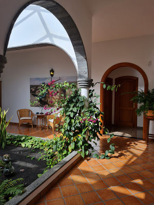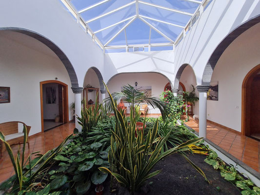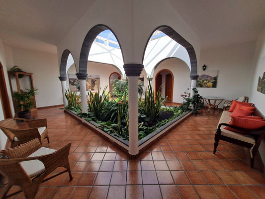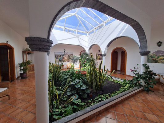 Die Wahl der Unterkunft auf Lanzarote und die frühe Reservierung fällt auf die Finca de la Geria, ein großes Haus mit fünf Schlafzimmern, zwei Bädern, Küche und Esszimmer, das einsam und weitab vom Tourismus inmitten des Weinanbaugebiets von La Geria im Herzen von Lanzarote liegt. Die architektonische Besonderheit der Finca ist die Anordnung aller Zimmer um einen zentralen lichtdurchfluteten Patio. Erreichbar ist diese außergewöhnlich schöne Unterkunft mit unseren zwei Mietwagen vom Flugplatz Lanzarote in 15 Minuten. Und diese zentrale Lage ist ebenso günstig zum schnellen Erreichen von Supermärkten und allen touristischen Einrichtungen auf Lanzarote.