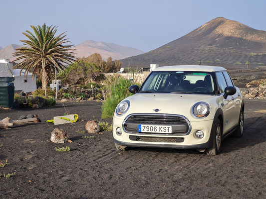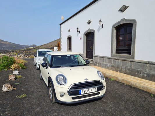 15:00 Abholen von zwei Mietwagen bei PlusCar am Flughafen Lanzarote (Fiat Panda und Mini Cooper One) und Transport von 5 Personen und Gepäck zur Finca de la Geria.