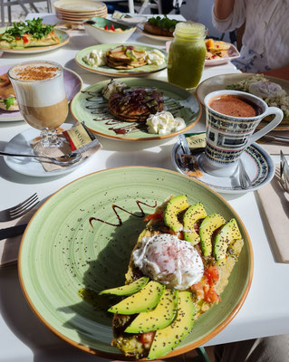 Tag 7: Fr, 22.4.2022 - Franks 80. Geburtstag - Frühstücken im Suculenta Café an der Costa Teguise - Mittags Wanderung zum Volcán de Cuervo und in die Caldera de los Cuervos - Nachmittags Kaffeetrinken in der Finca de la Geria - Abends bis Mitternacht Abendessen und Konzert in Jameos del Agua
